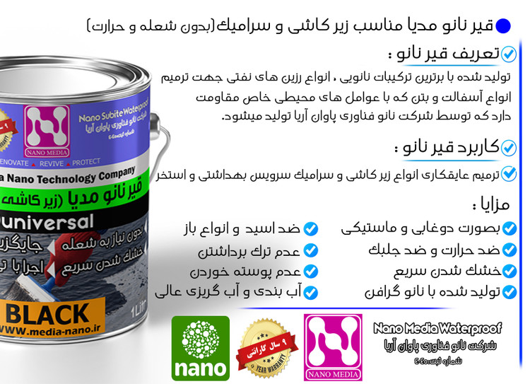 قیر نانو مدیا زیر کاشی و سرامیک یک نوع پوشش پلیمری و نانویی است که روی سطوح بتنی و سیمانی کاربرد دارد و پس از اجرا سطح مورد نظر را مومیایی نموده و در مقابل رطوبت، خوردگی و بطور کلی عوامل نفوذ کننده محافظت میکند. محصول مورد نظر با نفوذ و مومیایی کردن بتن برای همیشه از نفوذآب، خوردگی و پوسیدگی جلوگیری میکند و با قدرت نفوذکنندگی فوق العاده، تمام خلل و فرج بتن و سیمان را پر کرده و سطح را واترپروف میکند.